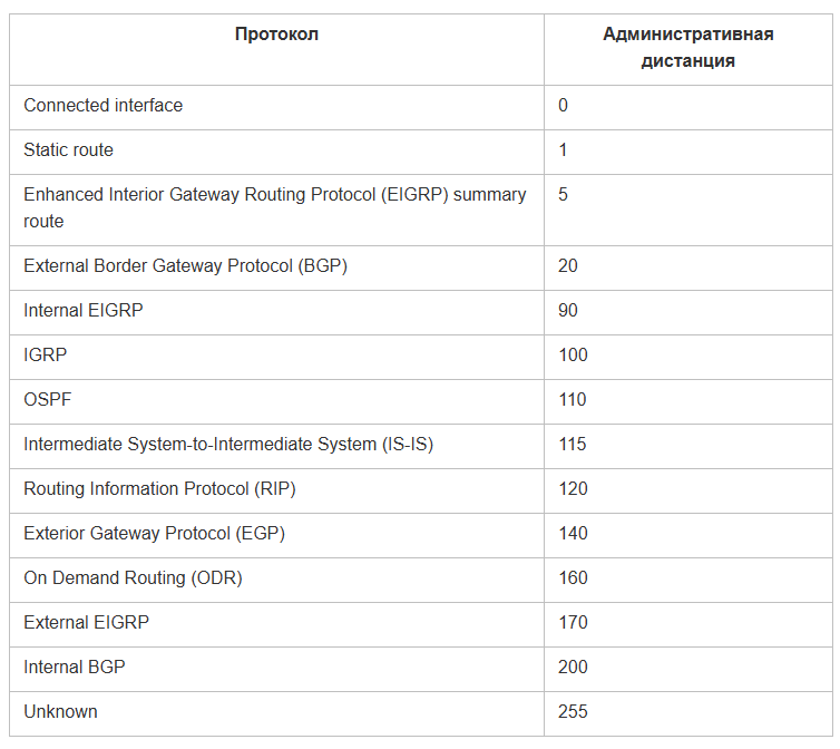 Как мы видим, количество протоколов маршрутизации невелико, но все же не один-два. А что будет, если на роутере запустить несколько протоколов одновременно? Может оказаться, что у каждого протокола будет свое мнение о том, как лучше добраться до определенной сети. А если у нас еще и статические маршруты настроены? Кому роутер отдаст предпочтение и чей маршрут добавит в таблицу маршрутизации? Ответ на этот вопрос связан с новым термином: административная дистанция (на нащ вкус, довольно посредственная калька с английского Аdministrative distance, но лучше выдумать не смогли). Аdministrative distance это целое число от 0 до 255, выражающее “меру доверия” роутера к данному маршруту. Чем меньше AD, тем больше доверия. Вот табличка такого доверия с точки зрения Cisco:
