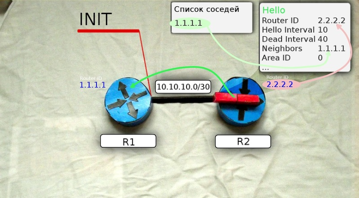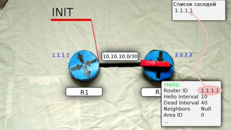 После получения этого мультикастного сообщения маршрутизатор R2 добавляет R1 в свою таблицу соседей (если совпали все необходимые параметры).