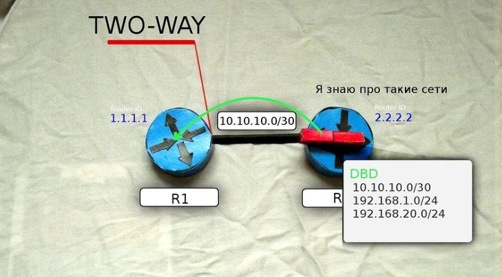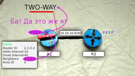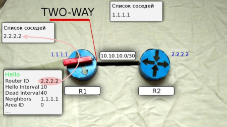 Теперь R1 и R2 друг у друга во взаимных соседях — это означает, что между ними установлены отношения смежности и маршрутизатор R1 переходит в состояние TWO WAY.