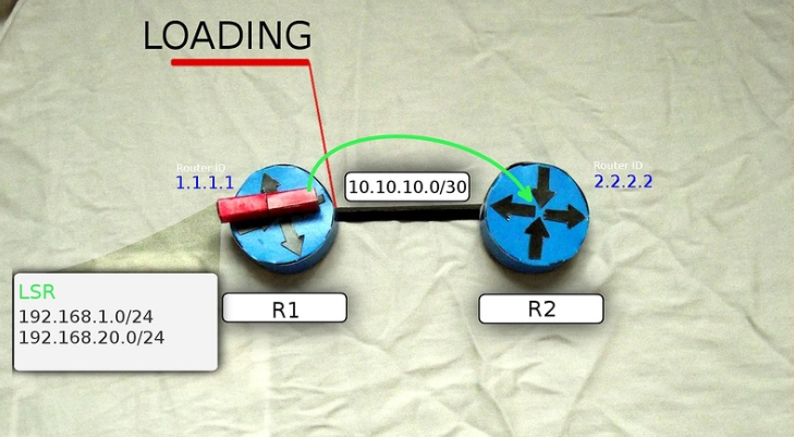 6) Получив сообщение, маршрутизаторы R1 и R2 отправляют подтверждение о приёме DBD (LSAck), а затем сравнивают новую информацию с той, что содержится у них в LSDB и, если есть отличия, посылают LSR (Link State Request) друг другу, тем самым переходя в новое состояние LOADING. В LSR они говорят — “Я про вот эту сеть ничего не знаю. Расскажи мне подробнее”.