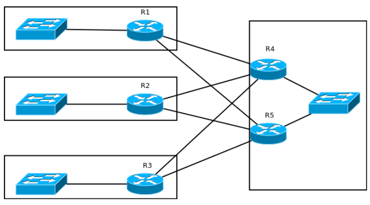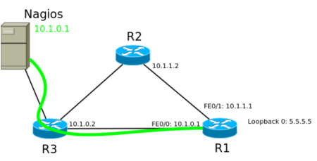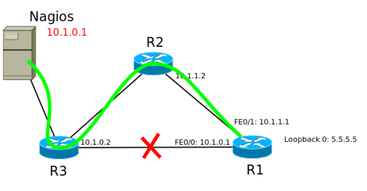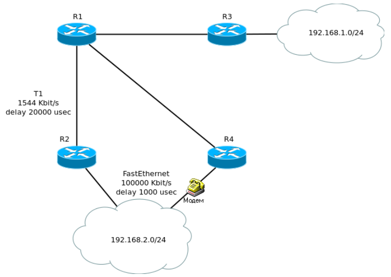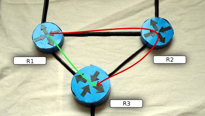 Например, в такой сети из R1 в R3 можно добраться напрямую или через R2.