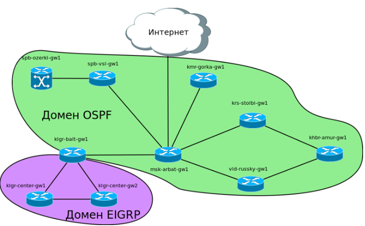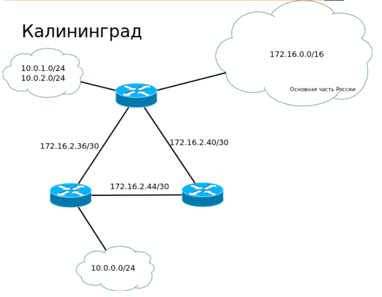 Но, так как сеть Калининграда достаточно большая, с большим количеством сетей, было решено, что необходимо отделить её от остальной сети так, чтобы изменения в сети Калининграда не приводили к запуску алгоритма SPF на других маршрутизаторах сети.