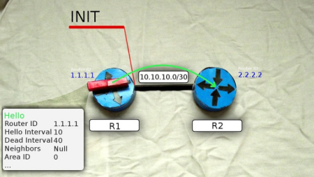 2) Поднимается ветер: маршрутизатор рассылает Hello-пакеты на мультикастный адрес 224.0.0.5 со всех интерфейсов, где запущен OSPF. TTL таких сообщений равен одному, поэтому их получат только маршрутизаторы, находящиеся в том же сегменте сети. R1 переходит в состояние INIT.