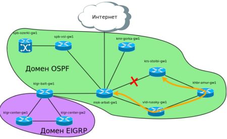 Переход должен быть совершен без разрывов связи. Было решено, что лучшим вариантом будет параллельно с EIGRP поднять OSPF на трёх маршрутизаторах Калининграда и после того, как будет проверено, что вся информация о маршрутах Калининграда распространилась по остальной сети и наоборот, отключить EIGRP.