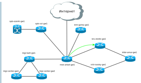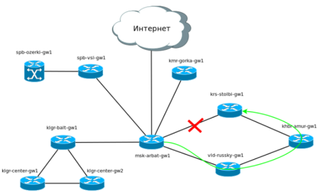 Предположим, что Красноярск у нас так же подключен через «Балаган телеком», как и предыдущие точки, а далее через разных провайдеров нам организованы линки к другим городам. Кольцо замыкается в Москве через провайдера “Филькин сертификат”. Предположим, что везде между городами у нас куплен L2-VPN и IP-трафик ходит прозрачно.